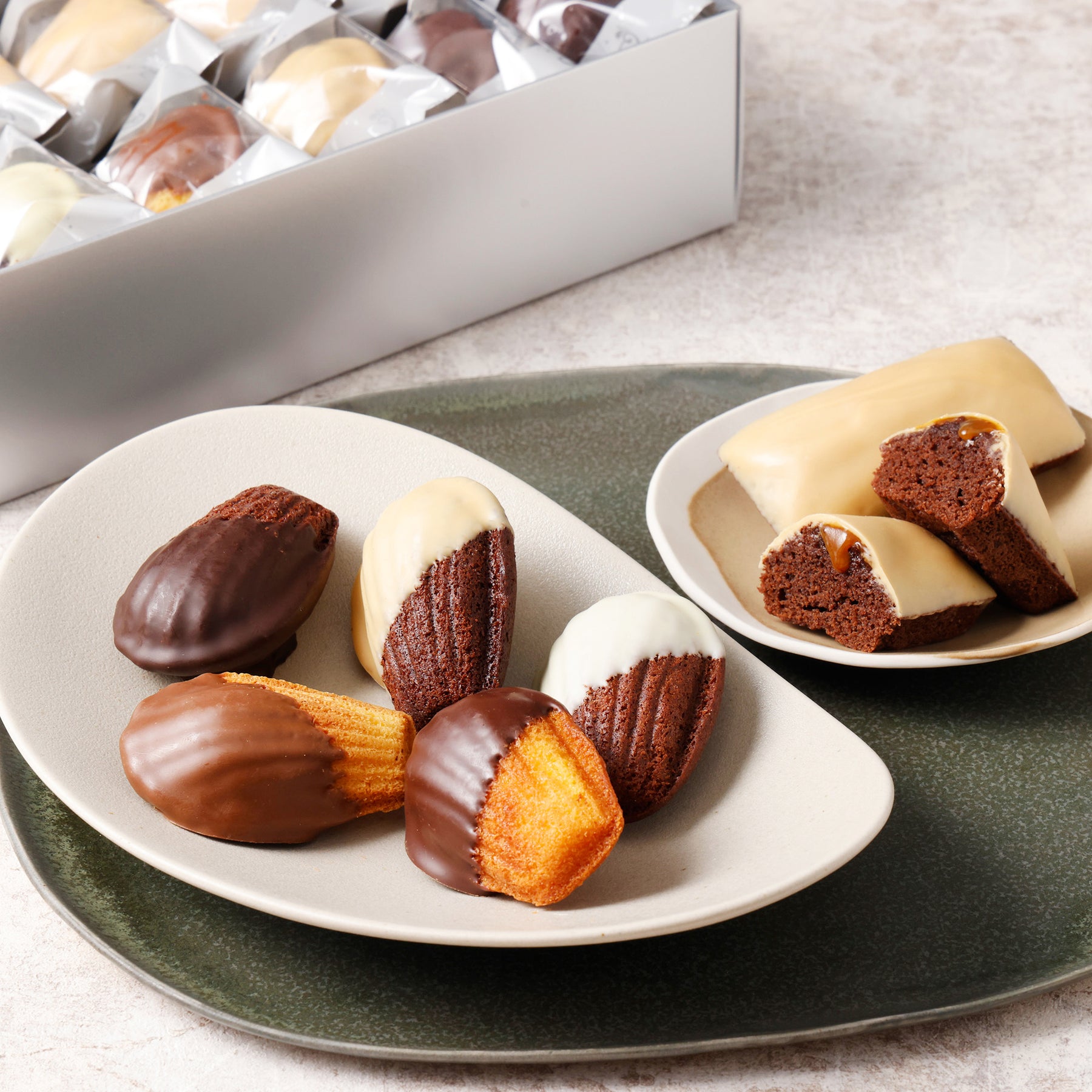 プレーンとショコラの2種の生地に、カカオの産地や苦味が異なるチョコレートをディップ。ひと口目からチョコと生地が一体となった濃厚な風味を楽しめ、食べ進めるごとに生地の香ばしさとバターの豊かな香りが広がり、奥行きある味わいに仕上げました。