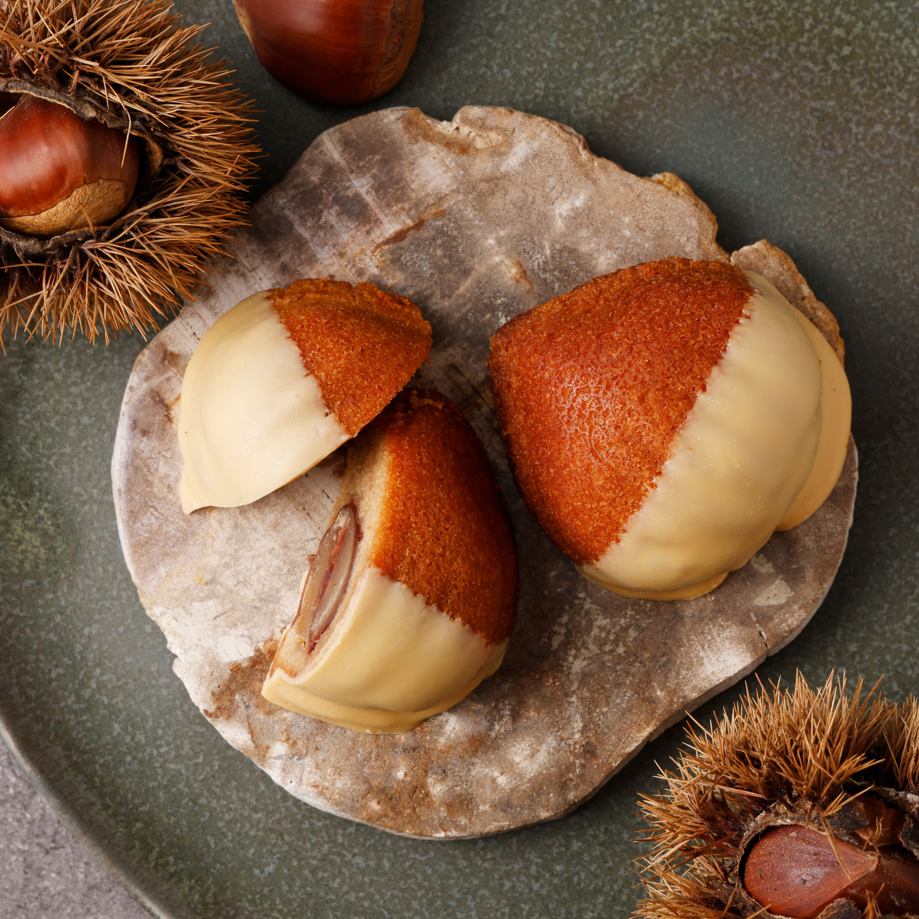 ふっくらと可愛らしい栗の形に焼き上げ、ブロンドチョコレートを贅沢にディップ。