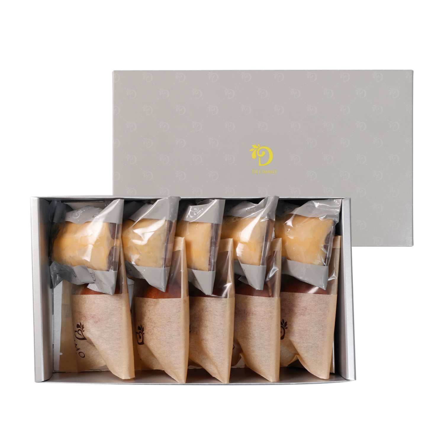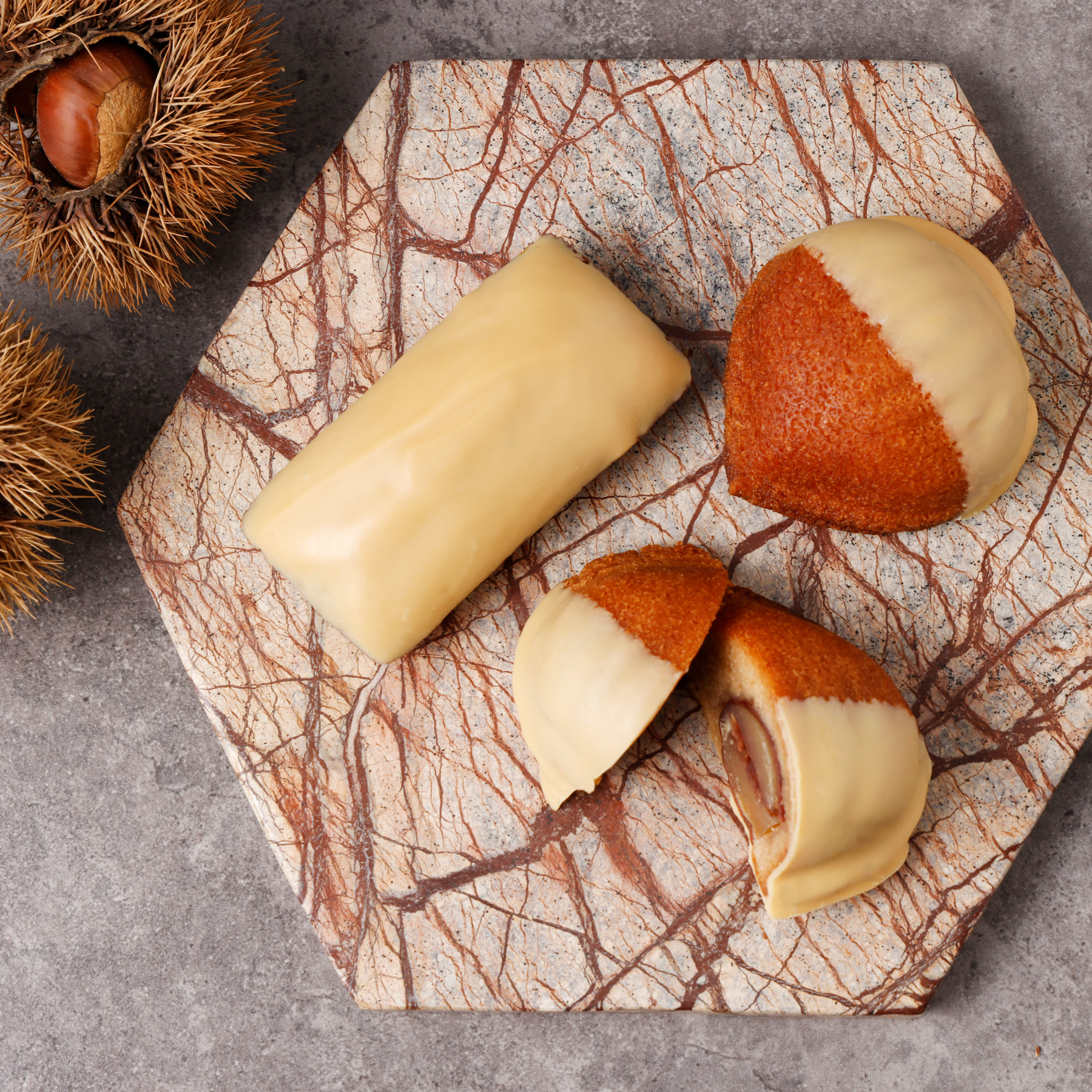 香ばしいブロンドチョコレートのフィナンシェと、栗マロンのほっくりとした甘さが、このセットで互いを引き立て合います。手に取るとひと口ごとにブロンドチョコレートの奥深い風味と栗のやさしい甘みの違いを楽しめるセットです。