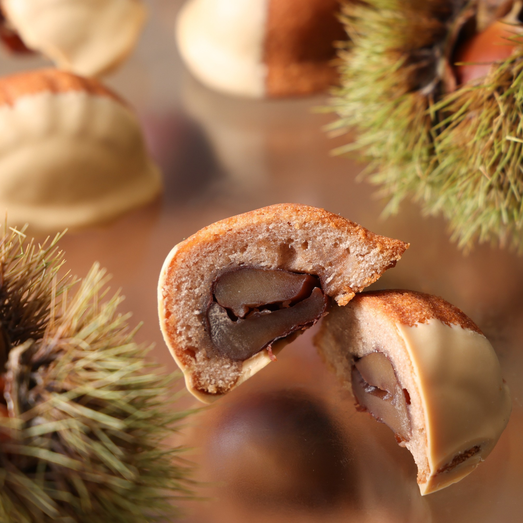 ふっくらと可愛らしい栗の形に焼き上げ、ブロンドチョコレートを贅沢にディップ。