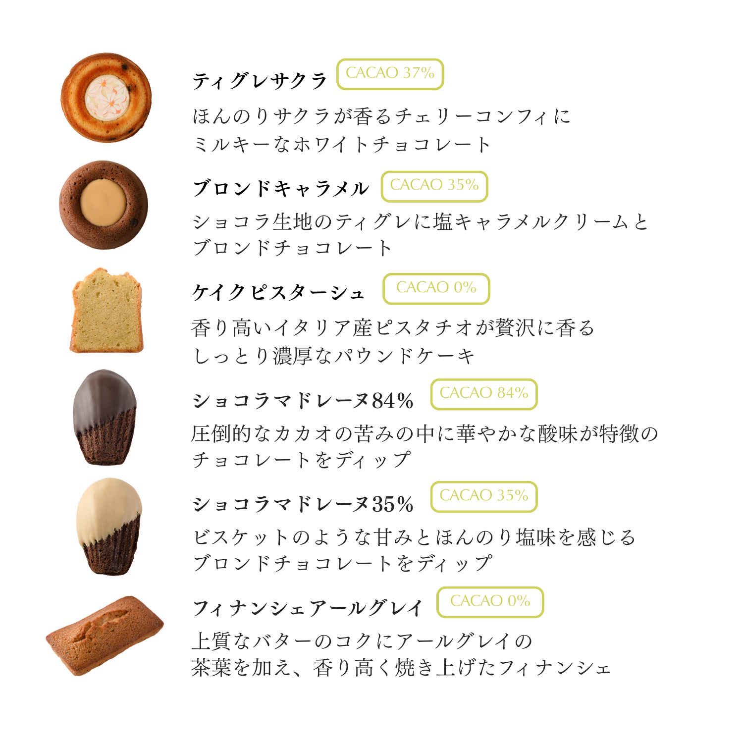 ショコラ生地のティグレに柔らかい味わいの塩キャラメルクリームとブロンドチョコレート。カフェラテやミルクティー、ウバやスパイス入りのロイヤルミルクティーやチャイが最高のマリアージュです