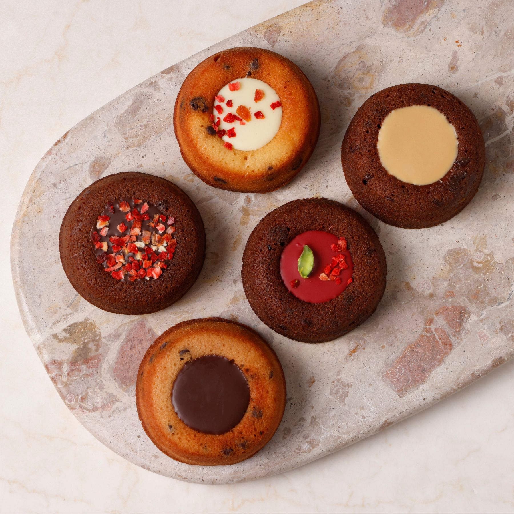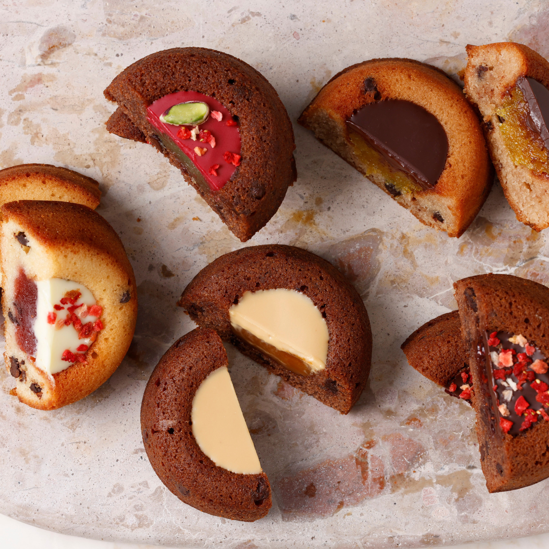 口どけよく焼き上げるために金属製の型と熱風の出るオーブンで焼き上げます。 表面は香ばしく中はしっとり焼き上げる事で、中に詰めるガナッシュやクリーム、ジュレのコントラストが特徴的な味わいを生みます。保存料などを使わずに常温で持ち運べるようになっています。
