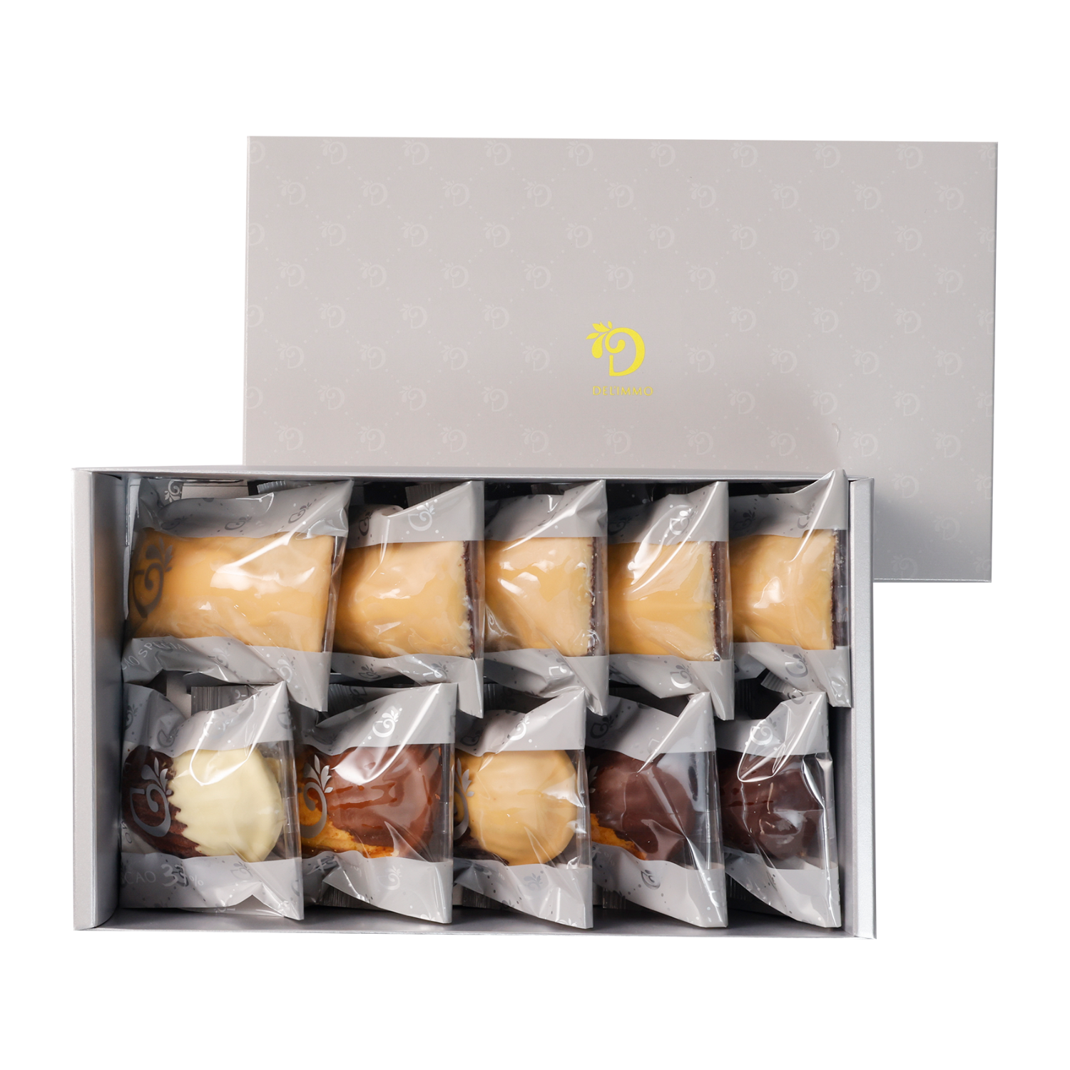天面は、カカオバターを豊富に使用したブロンドチョコレートでコーティング。ビスケットのような香ばしさとキャラメルのコクが一体となる、至福の口どけをお楽しみください。