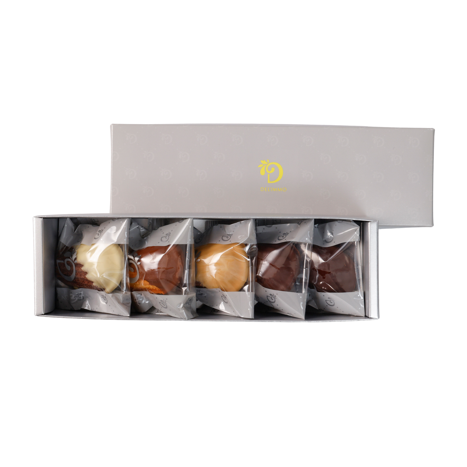 バターと卵の量を極限まで抑え、しっとりと口どけのよい食感に仕上げました。チョコレートをディップした部分と生地の味わいの差を最小限にすることで、最初の一口からチョコと生地が一体となった濃厚な風味を楽しめます。