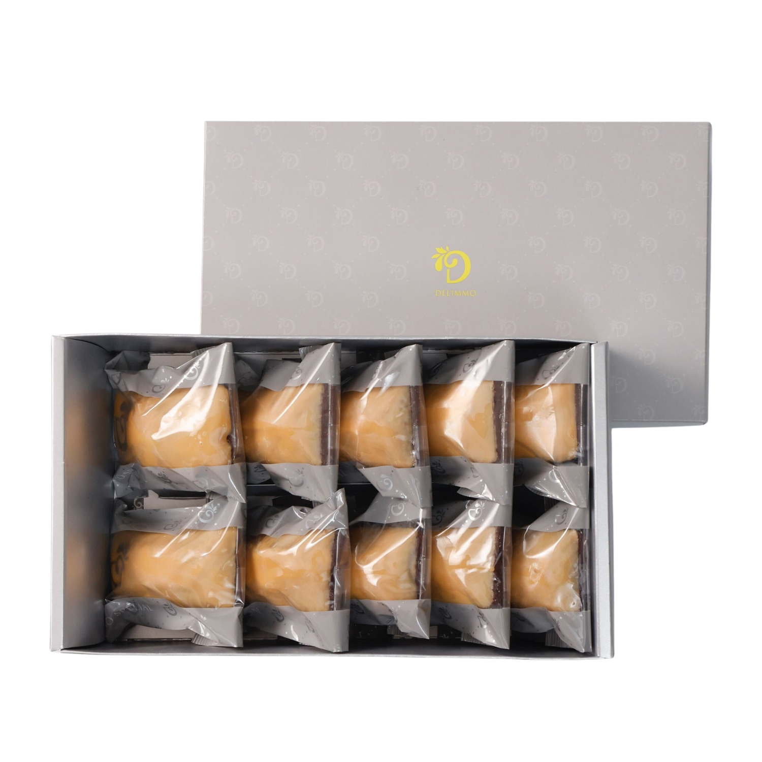 スモーキーな奥深い香りが特徴のショコラを使用し、表面をキャラメルやビスケットのような味わいのブロンドチョコレートでディップ。